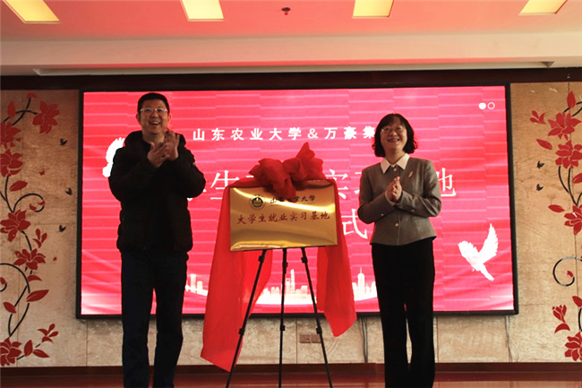 近日,山东农业大学大学生就业实习基地签约揭牌仪式在山东万豪集团举行,学校党委副书记张然、万豪集团董事长丁绍武共同为基地揭牌。