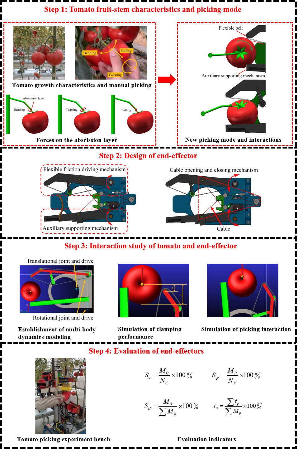 近日,机电学院苑进教授团队在《Computers and Electronics in Agriculture》,发表题为“Design and interaction dynamics analysis of a novel hybrid bending-twisting-pulling end-effector for robotic tomato picking”的最新研究成果。博士研究生方家明为论文第一作者,机电学院苑进教授和刘雪美教授为共同通讯作者,辛振波副教授、戴念祖博士生参与课题研究,我校为唯一通讯单位。