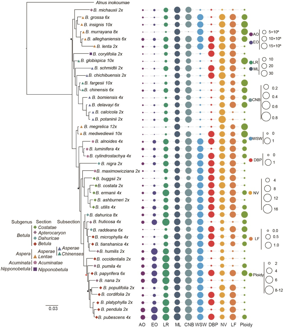 图1 桦木属物种系统发育关系、地理分布面积、性状及倍性。