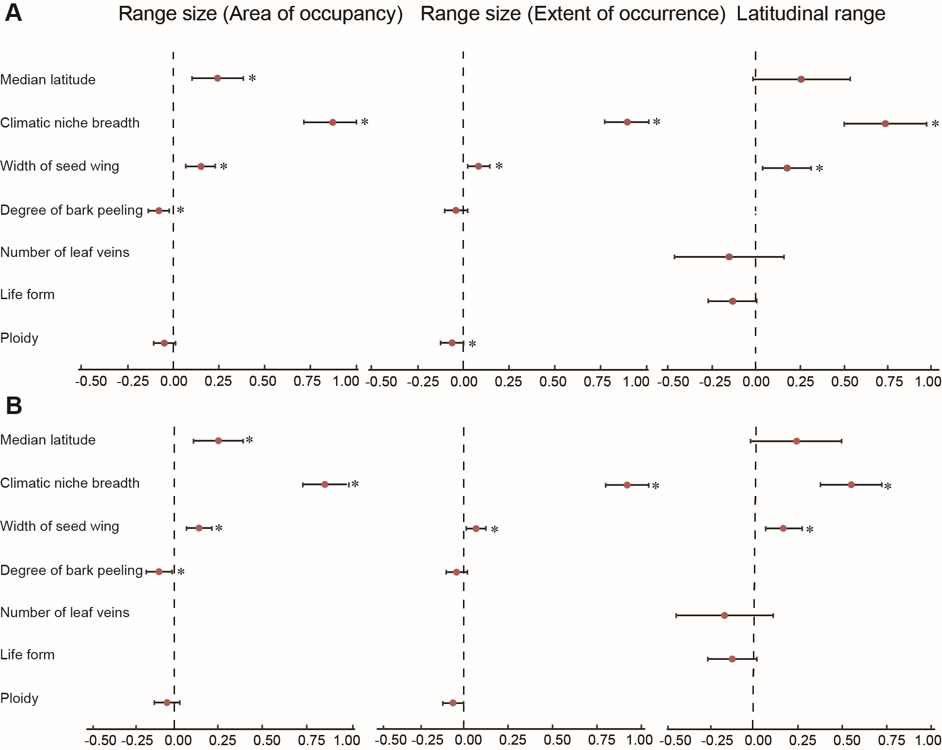 研究结果表明桦木属物种的分布区大小最多可以跨越8个数量级。桦木属物种的分布受温度变量的影响比受降水变量的影响更大。此外,桦木属地理分布面积、性状(如种子翅长、生活型)及倍性存在显著的系统发育信号(图1)。排除系统发育信号的影响,气候生态位宽度及种子翅长同桦木属的地理分布呈现显著的正相关(图2)。本研究支持影响物种分布范围的生态位宽度假说,同时也支持扩散能力假说。相对于扩散能力,气候生态位宽度更能影响桦木属物种的分布大小。该研究为理解物种分布格局的形成机制及其对全球变化的响应提供了借鉴。
