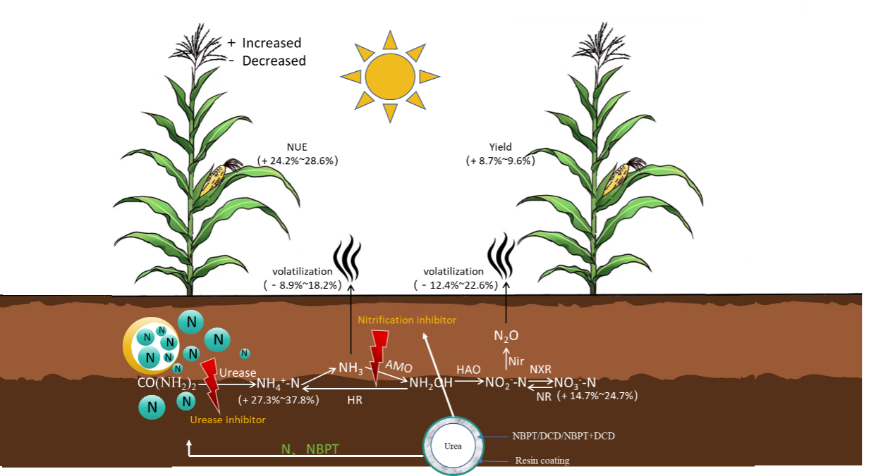 控释肥在提高氮肥利用效率方面被广泛认可,但其效果会受到环境因素的显著影响,导致实际应用中往往难以达到理想效果。氮肥增效剂由于水溶性较强,在土壤中持效性较差,难以发挥预期的增效作用。本研究将氮肥增效剂包覆在控释肥包膜内制成双膜控释肥,从而提升了传统包膜控释肥料性能。研究表明,双膜控释肥的应用通过调节土壤微生物群落结构和功能,影响土壤氮循环过程,从而降低全球增温潜势(GWP)和温室气体强度(GHGI)。该肥料的应用显著提高了耕层土壤的NH4+-N含量,并降低了深层土壤的NO3--N含量。该肥料的应用显著提高了耕层土壤的NH₄⁺-N含量,同时降低了深层土壤的NO₃⁻-N含量。与传统包膜控释肥相比,双膜控释肥使氮肥利用效率提高了17.7%,并显著提升了夏玉米的产量。总体而言,“双膜双控”模型在提升夏玉米产量和氮肥利用效率的同时,还能减轻环境污染和气体排放。这一成果为优化施肥管理、促进农业绿色生产提供了重要的理论依据与技术支撑。