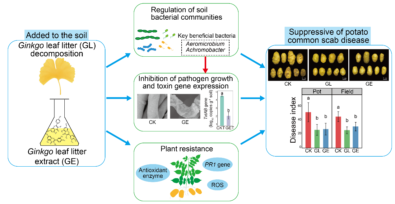 近日,山东农业大学生命科学学院高峥、周波教授团队在Journal of Environmental Management发表了题为“Progressing towards eco-friendly agricultural management: Utilizing Ginkgo bilobaleaf litter for potato common scab control”的研究论文。