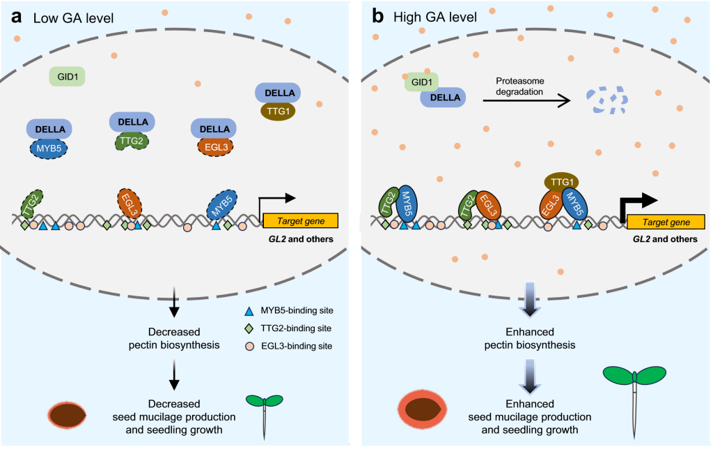 已有研究表明MYB-bHLH-WD40(MBW)复合体和TTG2促进果胶合成。在此基础上,该研究首先明确了GA通过依赖DELLA蛋白的方式促进果胶的生物合成。进一步研究发现DELLA蛋白分别与MBW复合体和TTG2直接互作,并抑制MBW和TTG2的结合。此外,DELLA抑制MBW复合体以及TTG2的DNA结合活性,进而阻遏其对下游靶基因的转录激活作用。遗传学分析进一步证实了GA通过DELLA-MBW-TTG2信号级联模块调控果胶合成,并在维持细胞粘附以及促进幼苗生长方面具有重要作用。