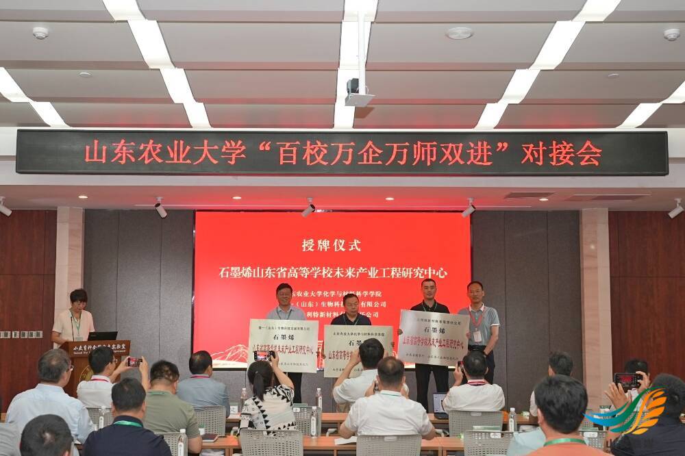 会上,矫立峰为山东农业大学化学与材料科学学院、山东金利特新材料有限责任公司、微一(山东)生物科技发展有限公司授予“石墨烯山东省高等学校未来产业工程研究中心”牌匾,各方下一步将依托中心做好校企联合研发,聚焦石墨烯未来产业技术创新需求做好技术研发、成果转化和推广应用工作。同时,学校分别与山东德普新材料科技股份有限公司、山东岱岳制盐有限公司、微一(山东)有限责任公司签订协议,将围绕成果转化、产学研合作、平台共建等开展合作。