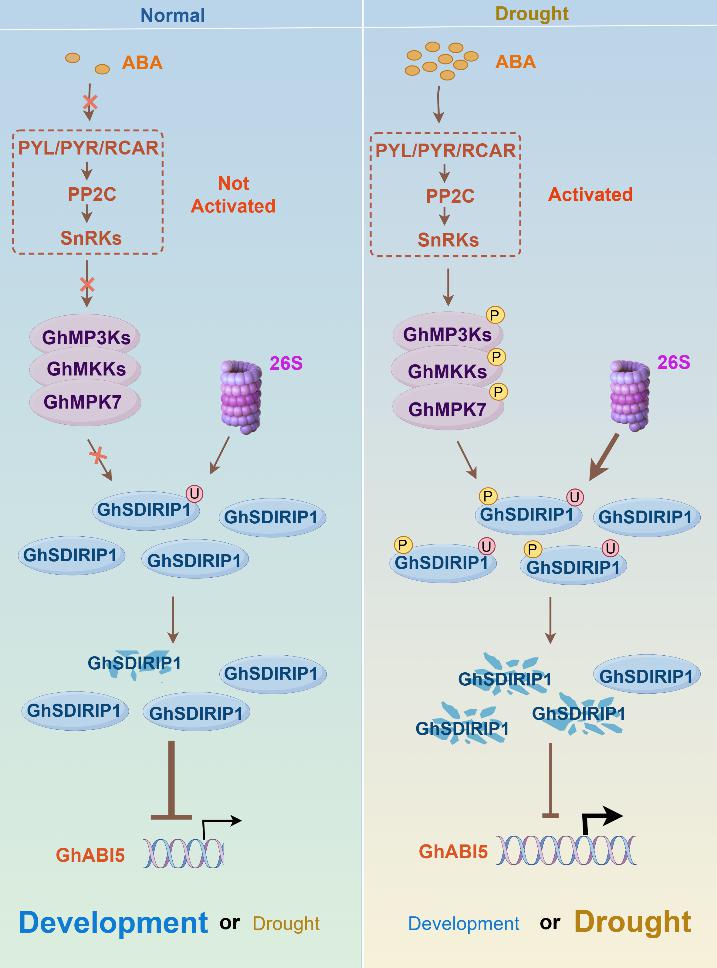 该研究发现,棉花C组MAPK,GhMPK7,在ABA介导的耐旱性中起到正调控作用。沉默GhMPK7转基因棉花对干旱胁迫的抗性显著降低。经过ABA处理后,沉默GhMPK7的转基因植株对ABA不敏感,气孔关闭受限,种子萌发速率更快,根更长。进一步的研究表明,ABA信号的负调控因子,GhSDIRIP1,与GhMPK7互作。在沉默GhMPK7的转基因棉花植株中再沉默GhSDIRIP1,能够恢复因GhMPK7沉默而导致的不耐旱表型。磷酸化实验结果显示,GhMPK7可以使GhSDIRIP1的第19位丝氨酸残基磷酸化,从而调控其稳定性。GhMPK7诱导的GhSDIRIP1蛋白降解会增强植物在干旱胁迫下的ABA信号强度。该研究的结果揭示了GhMPK7-GhSDIRIP1模块正调控ABA介导的植物抗旱性的调控机制。这项研究拓展了对MAPK级联通路如何调节植物中ABA信号通路强度的认识,也加深了对磷酸化和泛素化之间相互作用的理解。