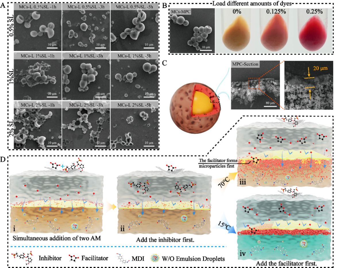 该研究系统揭示了在界面聚合过程中两亲分子对水相传质和囊壳结构的关键调控作用。研究发现,聚羧酸盐(PCE)可形成反胶束,将水相以乳滴形式跨界面输运至油相,进一步,乳滴中的水与异氰酸酯反应生成微米级颗粒,最终形成多孔的“微粒型”界面膜;而木质素磺酸钠(SL)作为两亲分子时,界面缩聚过程则倾向于形成致密连续的界面膜(图2)