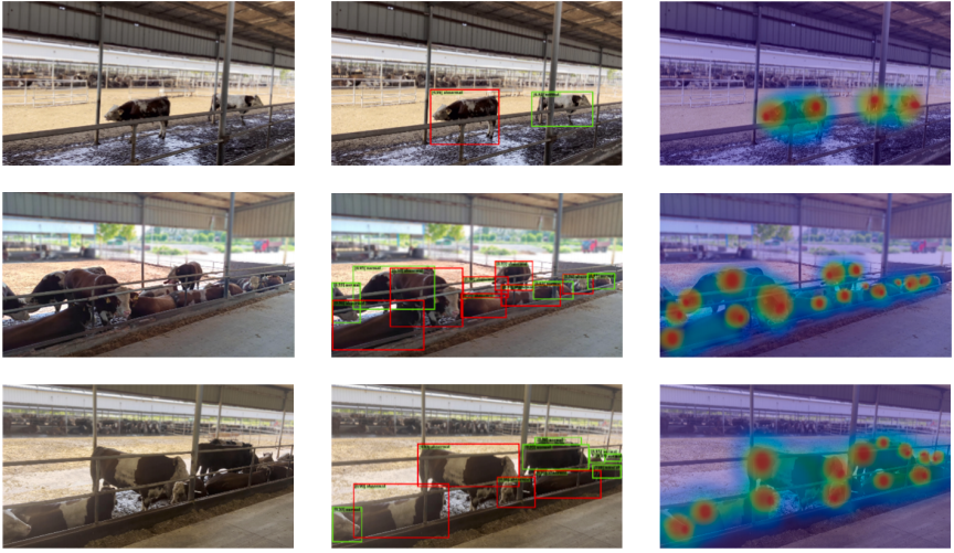 肉牛的健康监测是推动肉牛行业向“高效、安全、可持续”转型的关键支撑。在健康监测中,呼吸急促在牛中常与热应激、呼吸道疾病或代谢异常相关,流涎行为常与口腔疾病、中毒或神经系统异常,所以对呼吸急促和流涎行为的检测较为重要。然而,肉牛养殖密度大、遮挡严重,现有算法存在检测精度低、计算冗余等问题。