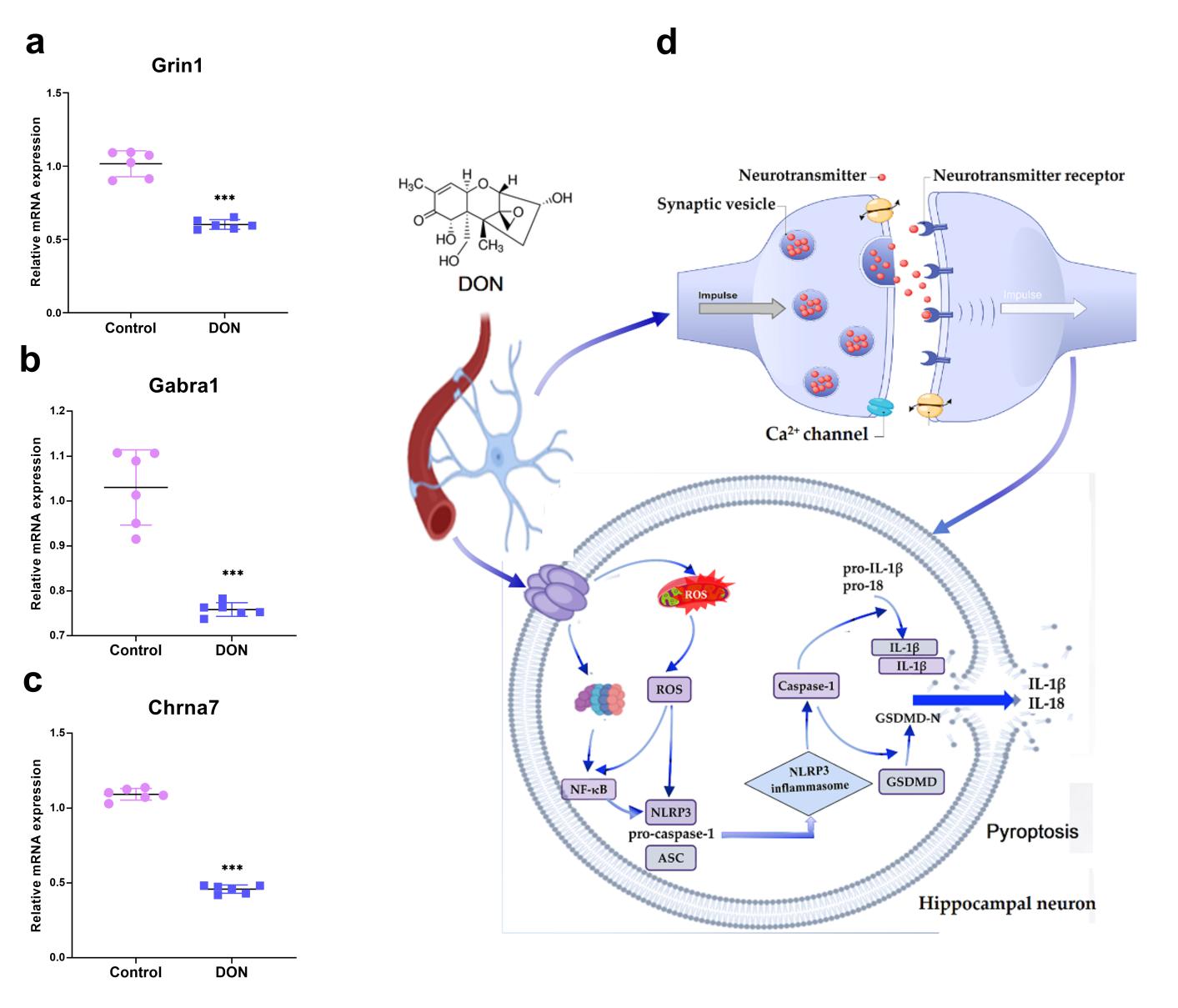 脱氧雪腐镰刀菌烯醇(DON)是一种广泛存在于小麦、玉米等谷类作物及饲料中的单端孢霉烯类霉菌毒素。该毒素可通过食物链对人类和动物健康造成严重威胁,引发包括肠道、肝脏及肾脏在内的多器官毒性反应。值得注意的是,DON能够直接穿透血脑屏障,干扰神经系统的稳态。近年来的研究表明,长期低剂量暴露于DON等霉菌毒素可能增加罹患神经退行性疾病的风险。鉴于神经退行性疾病与海马体区域的免疫炎症反应密切相关,海马体可能成为DON诱发神经炎症的关键靶器官。因此,本研究通过构建体外与体内实验模型,系统探讨DON诱导海马神经细胞焦亡的作用机制。研究结果显示,DON暴露可导致ROS过度生成,激活NF-κB信号通路,并上调NLRP3和ASC蛋白的表达水平,进而激活Caspase-1,促进炎症因子IL-1β与IL-18的成熟与释放,最终引发焦亡反应,造成海马神经元损伤。此外,DON显著干扰了海马神经细胞中多种神经递质的合成与释放过程。相关性分析进一步表明,这些神经递质的变化与阿尔茨海默病的发生密切相关,提示长期低剂量DON暴露可能是神经退行性疾病发展的重要风险因素。本研究不仅揭示了DON诱导海马神经细胞焦亡的分子机制,还发现其对神经递质稳态的破坏作用,为深入解析DON的毒理机制提供了新的研究视角。抑制Caspase-1炎性体的活性,从而缓解DON引发的神经炎症反应,可能成为一种具有前景的神经保护策略。