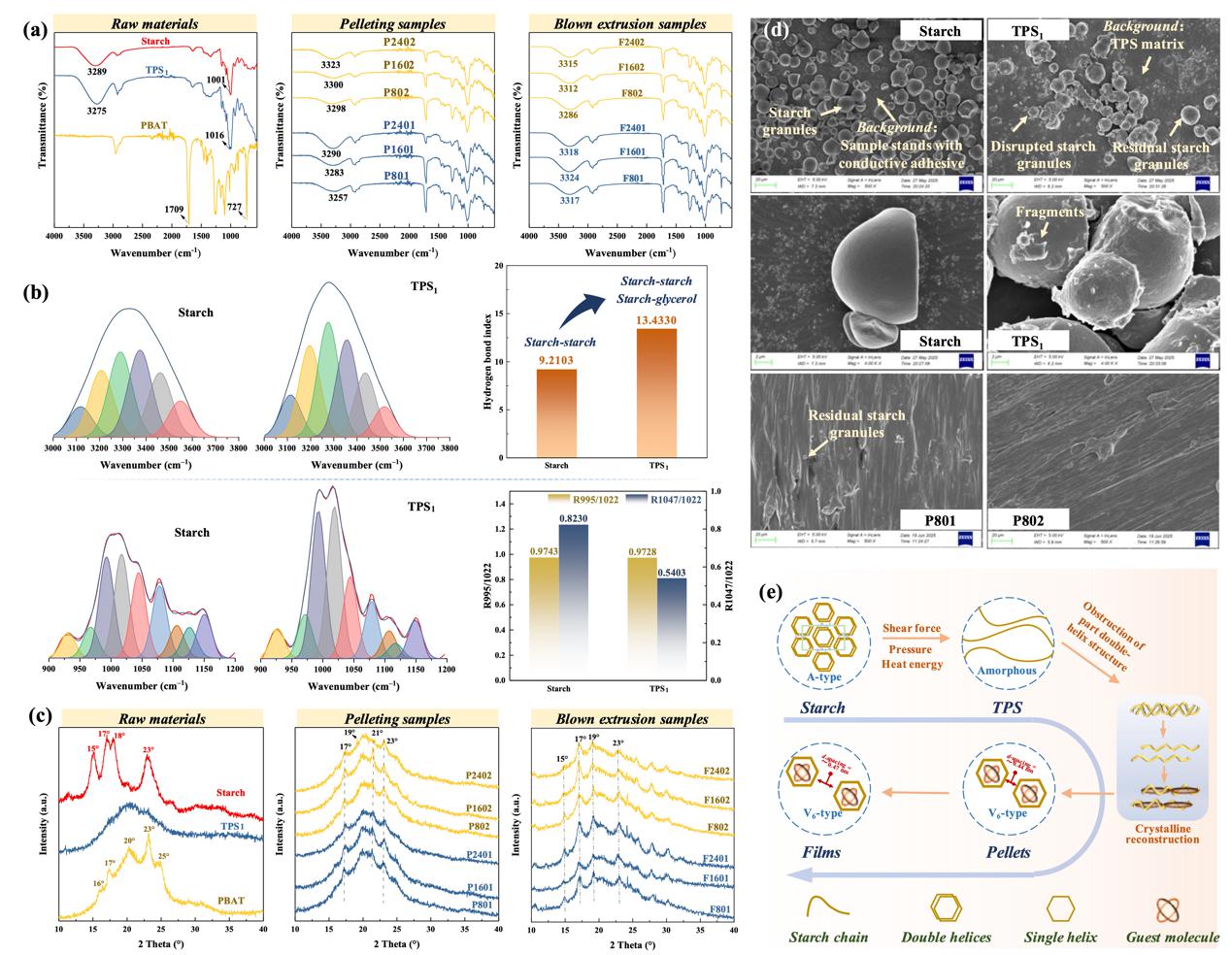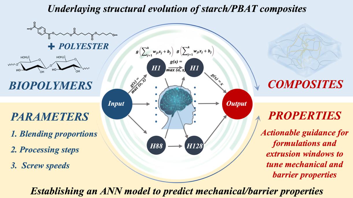 淀粉/聚对苯二甲酸-己二酸丁二醇酯(PBAT)复合材料是一种有前途的可生物降解材料,可用作食品、农业等多行业的可持续膜材。然而,双相体系的成膜过程较为复杂,难以系统地解析淀粉与PBAT在混合加工过程中所经历的分子结构、结晶结构及相结构转变。此外,大多数研究受限于样本数量较少,缺乏在加工参数与薄膜性能之间建立稳健的关联、预测模型。