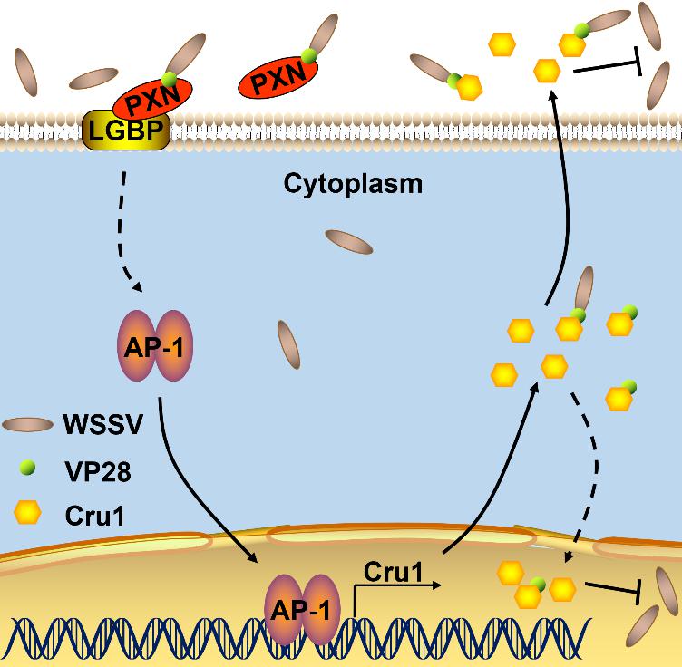 白斑病暴发每年造成虾蟹养殖业严重的经济损失,目前仍无有效的防治措施。细胞黏附蛋白(PXN)是髓过氧化物酶的同源物,通过调节酚氧化酶原系统防御细菌感染,其参与抗病毒免疫反应的机制尚不清楚。本研究发现胞外PXN识别WSSV的主要囊膜蛋白VP28,之后诱导胞内LPS和β-1,3-葡聚糖结合蛋白(LGBP)向细胞膜易位。PXN- VP28- LGBP复合物,以未知的方式促进AP-1活化并进入细胞核。AP-1进入细胞核后与Cru1启动子结合起始Cru1的转录。Cru1被分泌到胞外与病毒蛋白结合抑制WSSV再感染,在胞内通过与病毒蛋白相互作用抑制WSSV的组装。本研究揭示了PXN和LGBP参与抗病毒免疫的新的信号传导机制,为理解无脊椎动物抗病毒免疫提供了新视角。