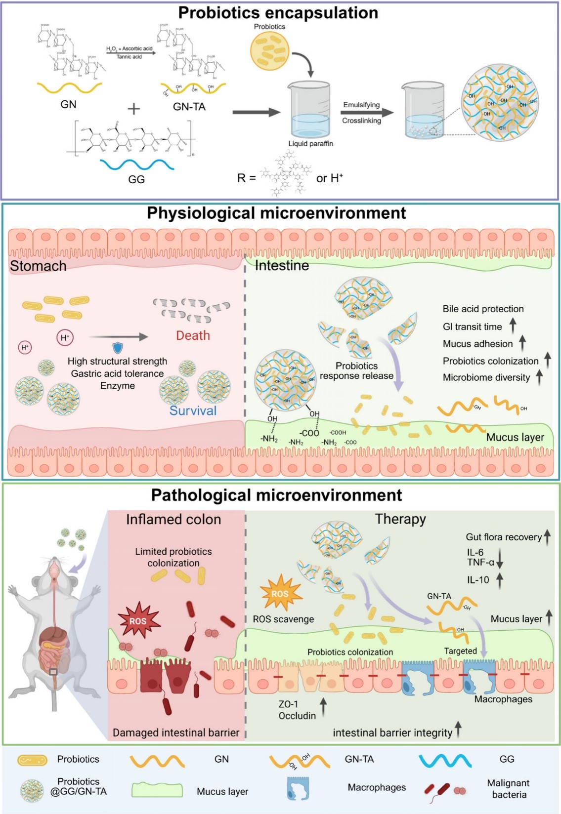 口服益生菌在调节肠道菌群、维持肠道稳态方面具有巨大潜力。然而,胃肠道的恶劣环境(如强酸、消化酶)导致益生菌存活率低,且其在复杂的肠道环境中定植率差、难以靶向作用位点,限制了其治疗效果。同时,常见天然多糖水凝胶微球材料也可能存在结构强度不足、凝胶稳定性不佳等问题,导致益生菌提前释放。