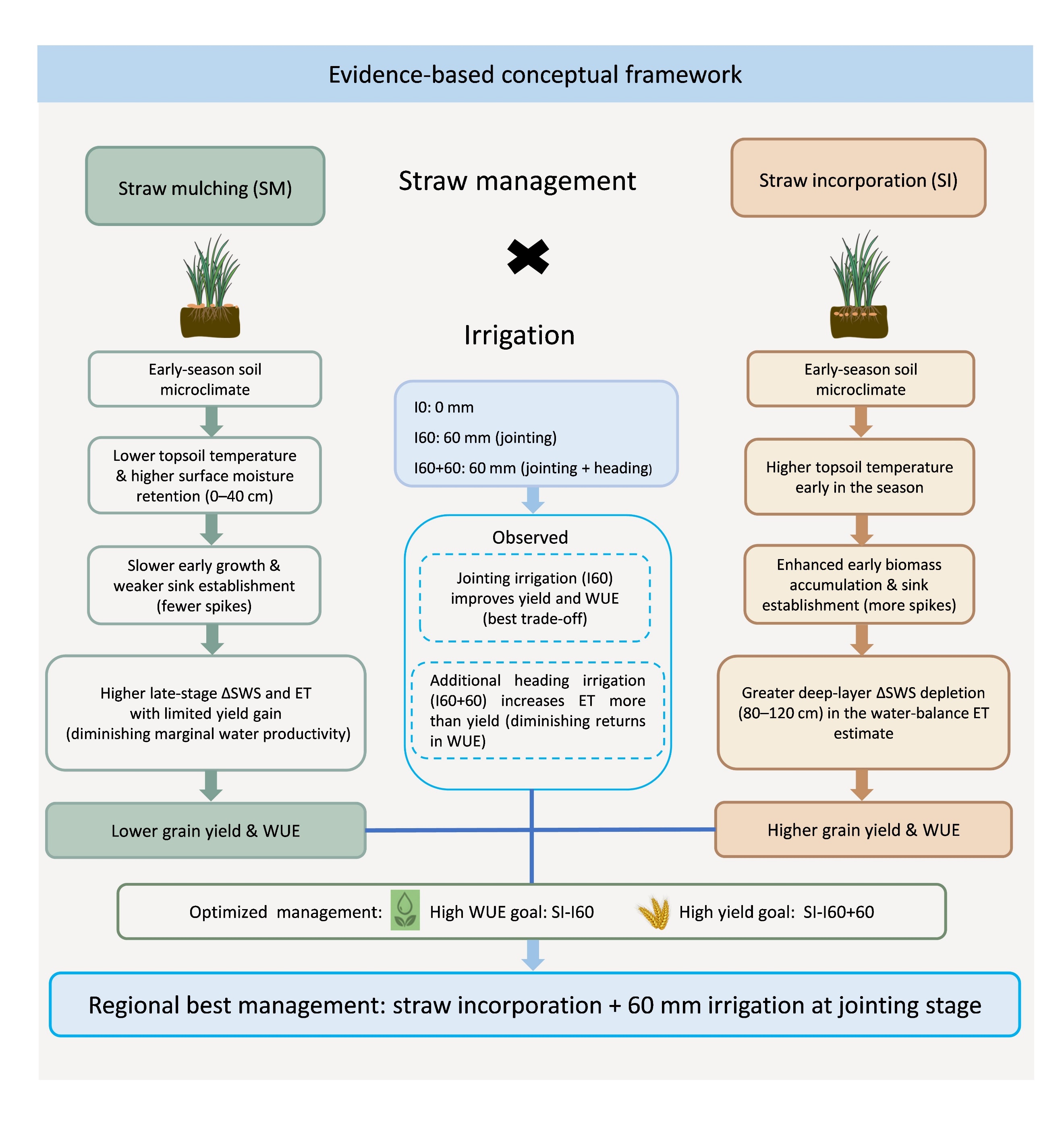 水资源短缺是制约粮食安全和农业可持续发展的重要因素。作为我国冬小麦主产区,华北平原冬小麦生产长期依赖灌溉,地下水超采问题较为突出。在此背景下,如何通过农艺措施协同提升冬小麦产量与水分利用效率,成为亟待解决的关键问题。针对这一需求,研究团队开展了连续两年的田间试验,系统比较了秸秆翻埋与秸秆覆盖在不同灌溉条件下对冬小麦土壤水分动态、蒸散耗水、干物质积累、产量形成和水分利用效率的影响。