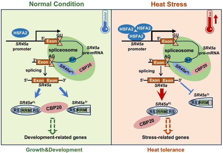 高温胁迫是限制植物生长发育和作物产量的重要环境因素之一。无论是短期还是持续的高温刺激,都会引发植物一系列复杂的生理与分子响应。可变剪接作为关键的转录后调控机制,在植物应对高温胁迫过程中发挥重要作用。然而,胁迫信号如何在剪接调控因子自身层面实现精细调控,仍缺乏系统性认识。