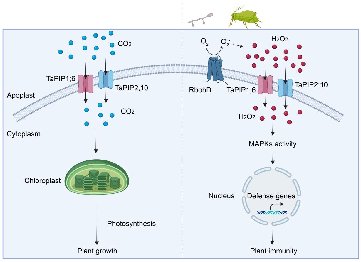 在正常生长条件下,TaPIP1;6和TaPIP2;10作为CO₂运输通道,促进大气中的CO₂向叶肉细胞运输,增强光合作用效率,提高小麦籽粒产量。然而,当小麦遭受白粉菌或麦长管蚜侵袭时,质外体H₂O₂爆发,TaPIP1;6和TaPIP2;10转为H₂O₂运输通道介导H₂O₂从质外体向细胞质运输,迅速激活MAPK级联反应、胼胝质沉积和防卫基因表达,从而提高小麦对白粉病和麦长管蚜的抗性。进一步研究表明,在小麦中双过表达TaPIP1;6和TaPIP2;10对CO₂和H₂O₂具有协同效应,双基因过表达植株比单基因过表达植株表现出更高的籽粒产量和病虫抗性。该研究揭示了水通道蛋白在调节生长-防御权衡中的重要作用,为培育兼具高产和广谱抗病性的新品种提供重要理论依据和遗传靶点。